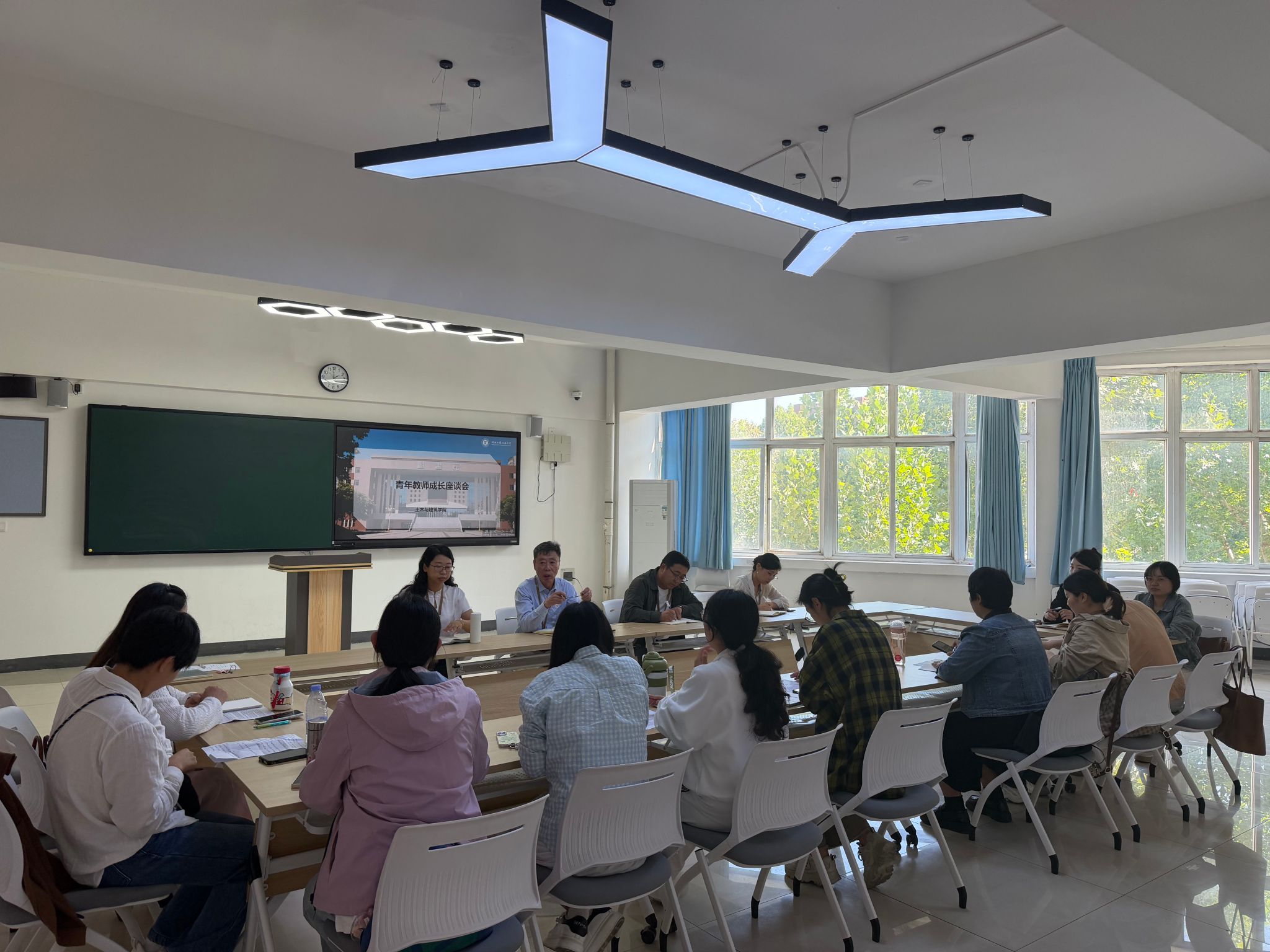 座谈会上,12位青年教师代表依次发言,现场气氛热烈。工程造价系申彤彤建议增设“投融资”、“造价全周期”等课程内容,并将企业真实项目引入毕业设计;土木工程系杨梦雪呼吁以AI、数字技术激活课堂,同时在大二开设写作与文献检索实训,补齐学生科研短板;城乡规划系李佳毓提出将“双碳”目标融入毕设选题,以绿色建筑、低碳发展提升专业吸引力;建筑学王昳昀、王泽宇则建议整合多学科毕业设计,打造“科研团队工作室”,通过承接社会项目锻炼师生实战能力。